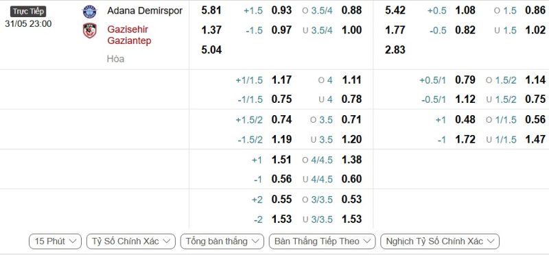 Trong hiệp 1, Adana Demirspor và Gaziantep FK nhiều khả năng sẽ nhập cuộc với nhịp độ vừa phải, chủ yếu thăm dò và tận dụng sai lầm của đối phương. Với tâm lý thoải mái từ cả hai bên, không loại trừ khả năng sẽ có bàn thắng sớm. Tuy nhiên, khả năng phòng ngự chưa đủ chắc chắn của cả hai đội khiến thế trận có thể rơi vào thế đôi công nhẹ. Mức kèo tài xỉu mà nhà cái niêm yết là 1.5 với tỷ lệ cho tài là 0.86, tỷ lệ cho xỉu là 1.02, người chơi nên đặt niềm tin vào cửa tài cho hiệp đấu này.