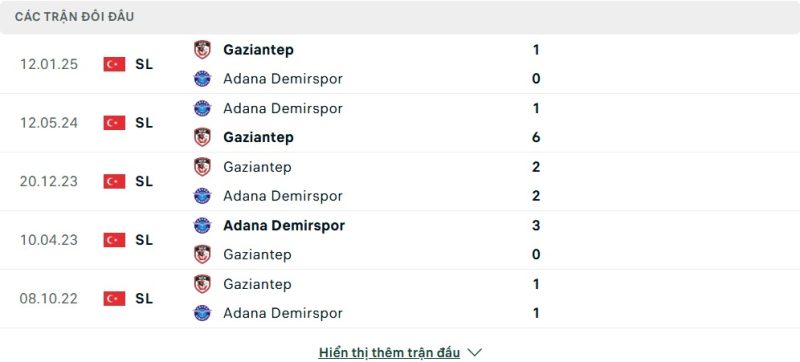 Thành tích đối đầu của Adana Demirspor vs Gaziantep FK