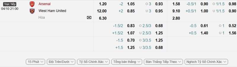Bảng Tỷ lệ kèo bóng đá Arsenal vs West Ham United