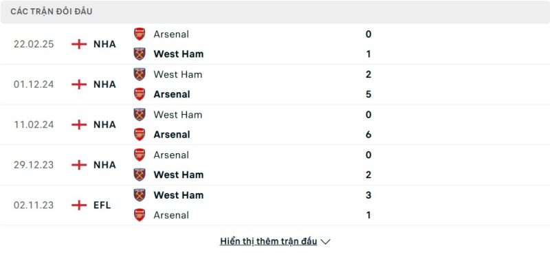 Thành tích đối đầu của Arsenal vs West Ham United