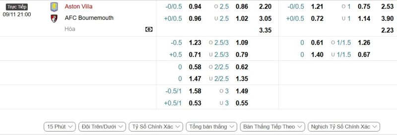 Bảng Tỷ lệ kèo bóng đá Aston Villa vs Bournemouth