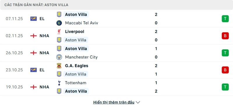 • Phong độ của Aston Villa