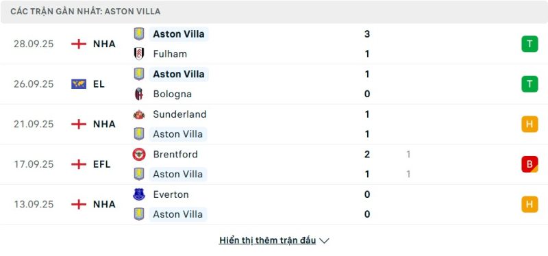 Aston Villa khởi đầu mùa giải khá chật vật. Trong 6 vòng đấu Premier League, họ thắng 1, hòa 3 và thua 2, hiện đứng thứ 16 trên bảng xếp hạng. Đáng chú ý, Aston Villa vừa có chiến thắng 3-1 trước Fulham và thắng 1-0 trước Bologna tại Europa League, thể hiện khả năng tận dụng cơ hội tốt. Tuy nhiên, đội bóng cũng thất bại 0-3 trước Crystal Palace và 0-1 trước Brentford, cho thấy hàng thủ đôi lúc vẫn thiếu tập trung. Phong độ trên sân nhà của Aston Villa có dấu hiệu cải thiện, đặc biệt khi họ giữ vững nhịp tấn công đều đặn và kiểm soát trận đấu khá tốt.