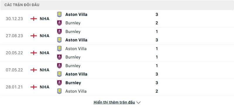Thành tích đối đầu của Aston Villa vs Burnley