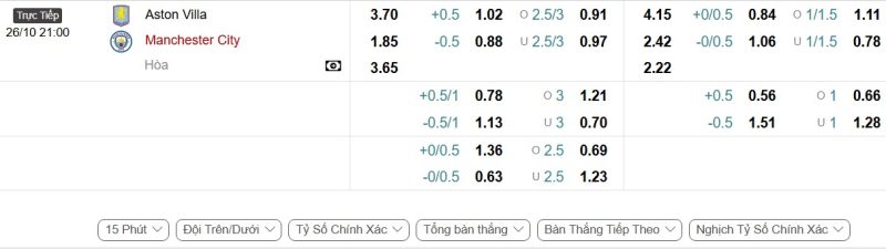 Bảng Tỷ lệ kèo bóng đá Aston Villa vs Manchester City