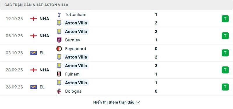 5 trận gần nhất của Aston Villa: W-W-W-W-W