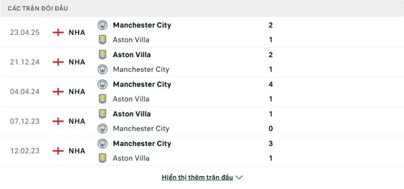 Thành tích đối đầu của Aston Villa vs Manchester City