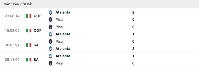 Thống kê phong độ gần đây Atalanta vs Pisa