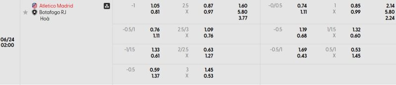 Bảng Tỷ lệ kèo bóng đá Atlético Madrid vs Botafogo