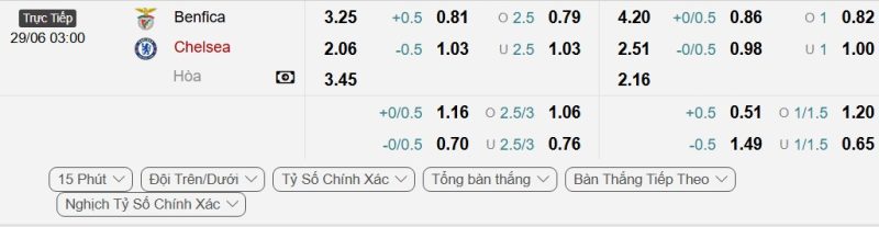 Bảng Tỷ lệ kèo bóng đá Benfica vs Chelsea