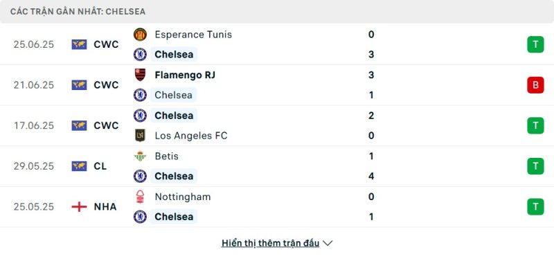 5 trận gần nhất của Chelsea: W-L-W-W-W
