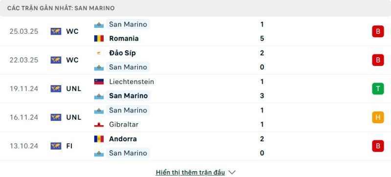 5 trận gần nhất của San Marino: L-L-W-D-L