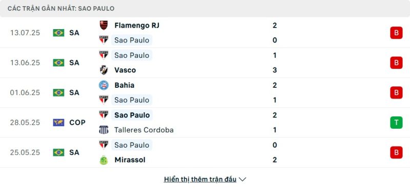 5 trận gần nhất của São Paulo: L-L-L-W-L