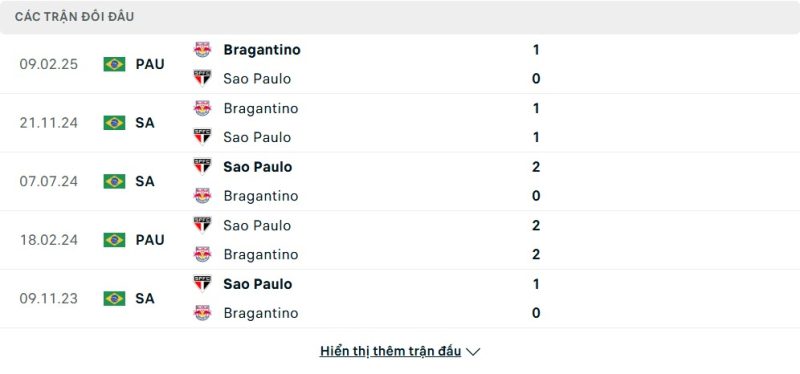 Thành tích đối đầu của Red Bull Bragantino vs São Paulo