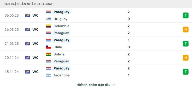 5 trận gần nhất của Paraguay: W-D-W-D-W