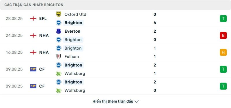 5 trận gần nhất của Brighton & Hove Albion: W-L-D-W-W