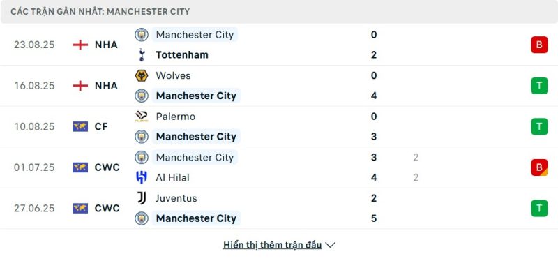 5 trận gần nhất của Manchester City: L-W-W-D-W