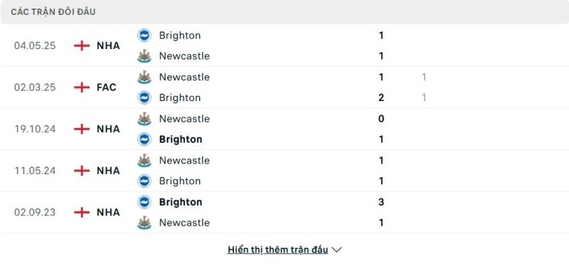 Thành tích đối đầu của Brighton & Hove Albion vs Newcastle United