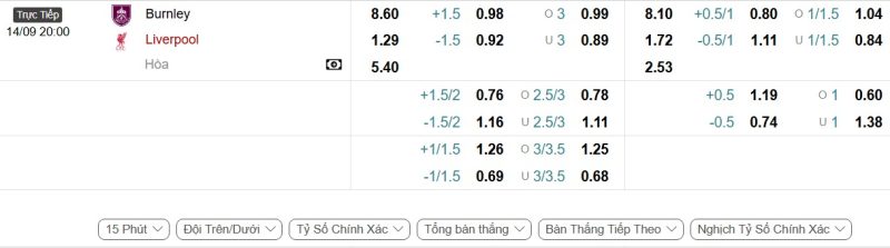 Bảng Tỷ lệ kèo bóng đá Burnley vs Liverpool