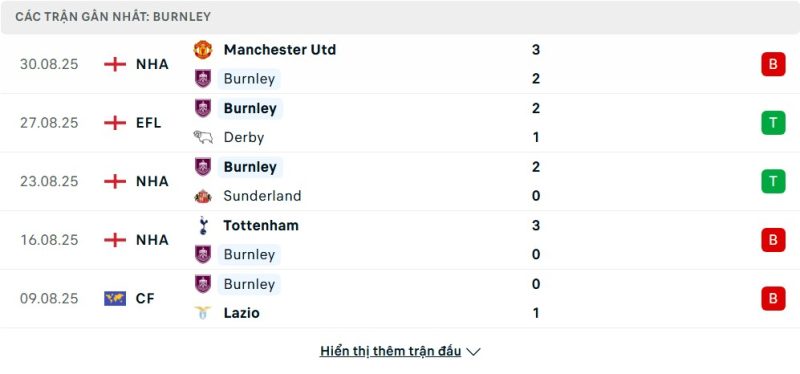 5 trận gần nhất của Burnley: L-W-W-L-L