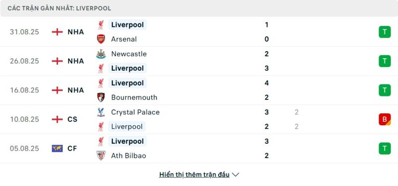 5 trận gần nhất của Liverpool: W-W-W-D-W