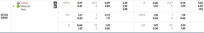 Bảng Tỷ lệ kèo bóng đá Ceará vs Mirassol