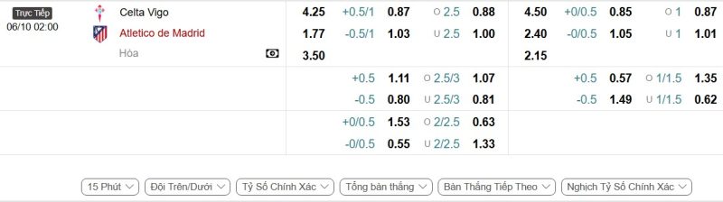 Bảng Tỷ lệ kèo bóng đá Celta Vigo vs Atlético Madrid
