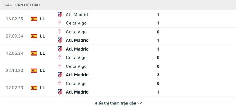 Thành tích đối đầu của Celta Vigo vs Atlético Madrid