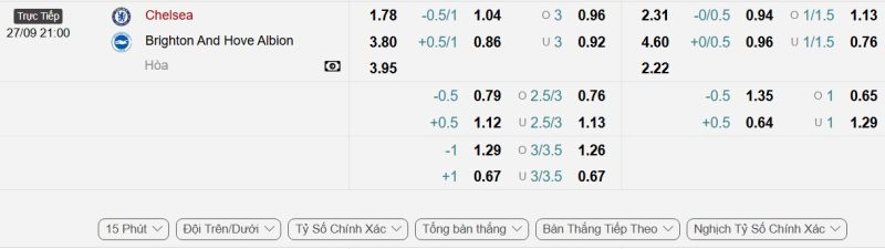 Bảng Tỷ lệ kèo bóng đá Chelsea vs Brighton & Hove Albion