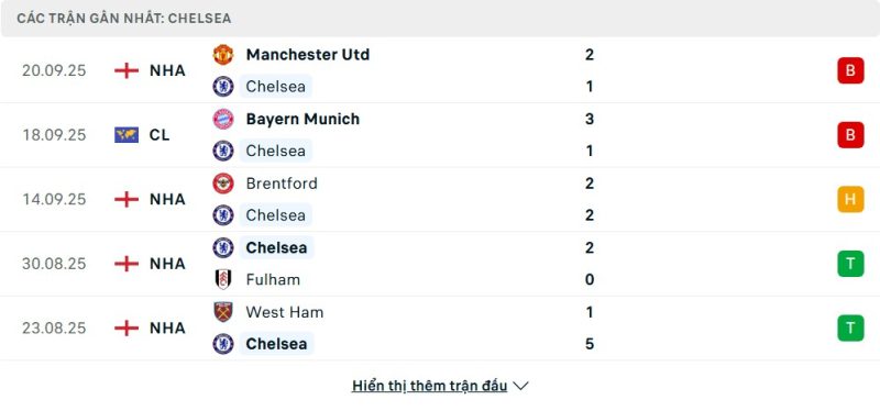 Thống kê phong độ gần đây Chelsea vs Brighton & Hove Albion