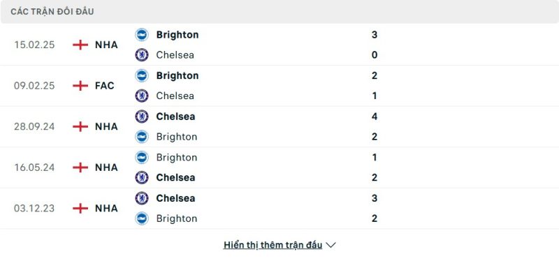 Thành tích đối đầu của Chelsea vs Brighton & Hove Albion