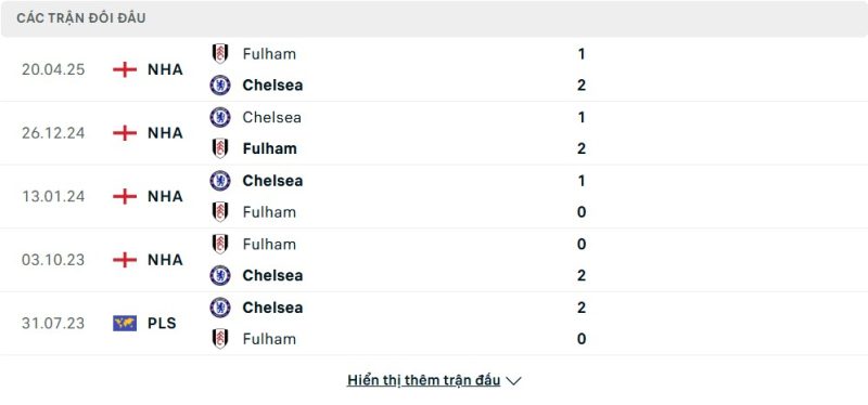 Thống kê phong độ gần đây Chelsea vs Fulham