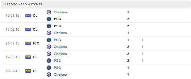 Thành tích đối đầu của Chelsea vs Paris Saint-Germain