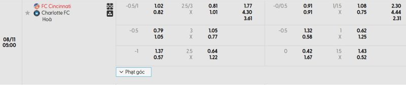 Bảng Tỷ lệ kèo bóng đá FC Cincinnati vs Charlotte FC