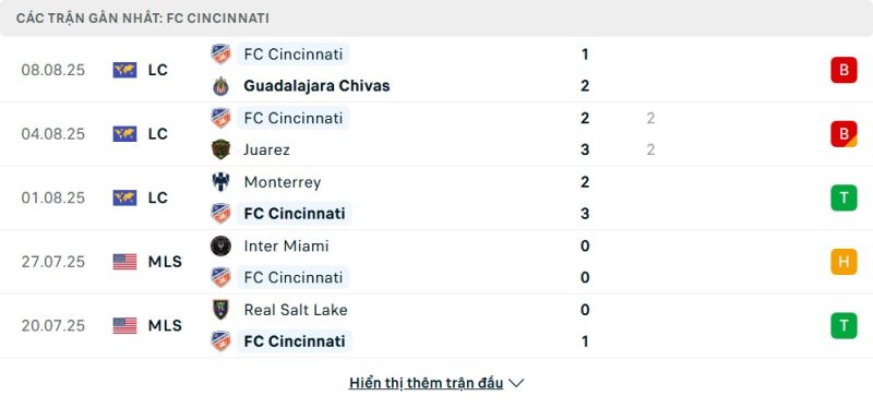 FC Cincinnati hiện đứng trong nhóm dẫn đầu MLS miền Đông, nhưng phong độ gần đây chưa thực sự thuyết phục. Họ thắng Monterrey 3-2 và Real Salt Lake 1-0, song lại trải qua hai thất bại liên tiếp tại Leagues Cup trước Juarez và Guadalajara Chivas. Đặc biệt, hàng công ghi bàn không đều, còn hàng thủ đôi lúc mất tập trung trong những thời khắc quyết định, khiến đội bóng bỏ lỡ cơ hội bứt phá trên BXH.