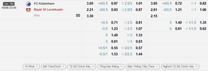 • Kèo tỷ số bóng đá hiệp 1: Copenhagen 0-2 Bayer Leverkusen