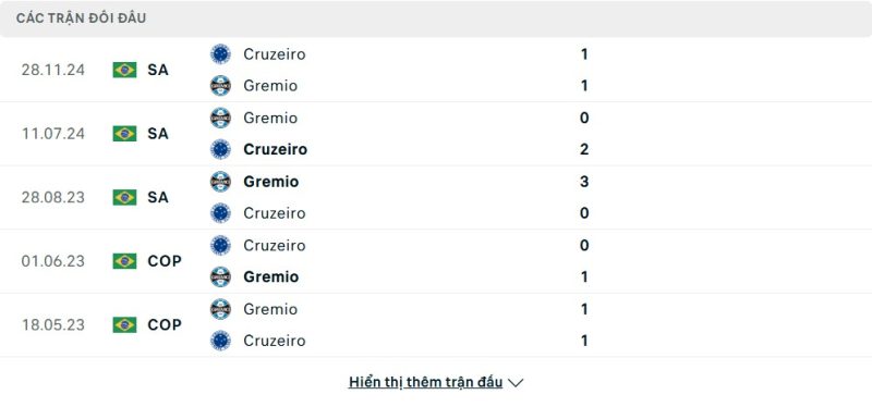 Thành tích đối đầu của Cruzeiro vs Grêmio