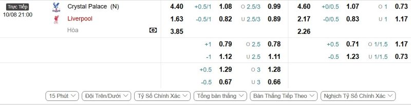 Bảng Tỷ lệ kèo bóng đá Crystal Palace vs Liverpool