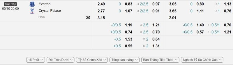 Bảng Tỷ lệ kèo bóng đá Everton vs Crystal Palace