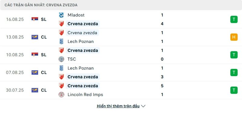 5 trận gần nhất của FK Crvena zvezda: W-D-W-W-W