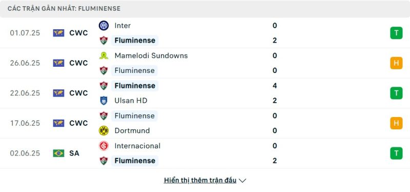 5 trận gần nhất của Fluminense: W-D-W-D-W