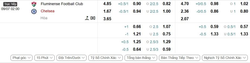- Kèo tỷ số bóng đá hiệp 1: Fluminense 0-0 Chelsea