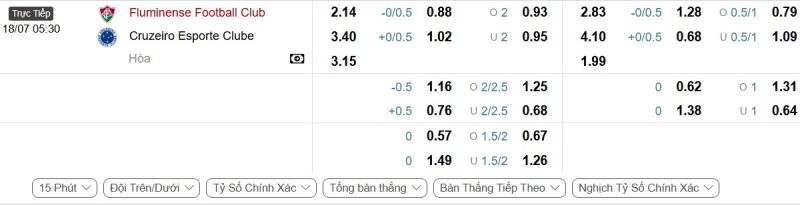 - Kèo tỷ số bóng đá hiệp 1: Fluminense 1-0 Cruzeiro