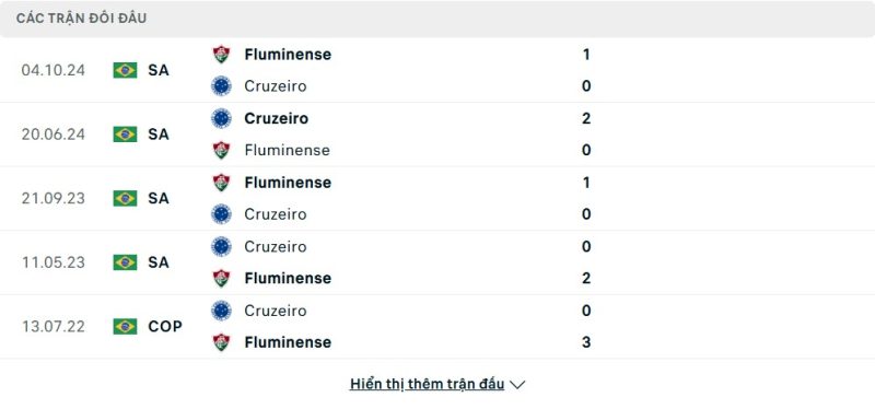 Thành tích đối đầu của Fluminense vs Cruzeiro
