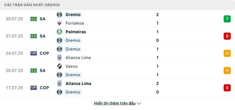 Thống kê phong độ gần đây Fluminense vs Grêmio