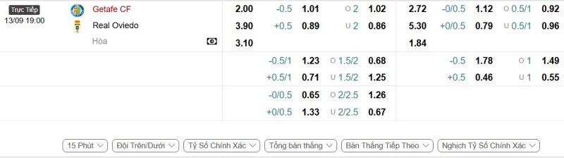 Bảng Tỷ lệ kèo bóng đá Getafe vs Real Oviedo