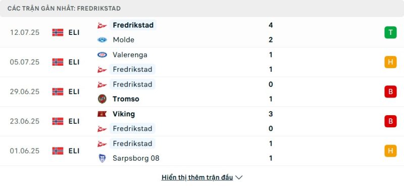 5 trận gần nhất của Fredrikstad: W-D-L-L-D