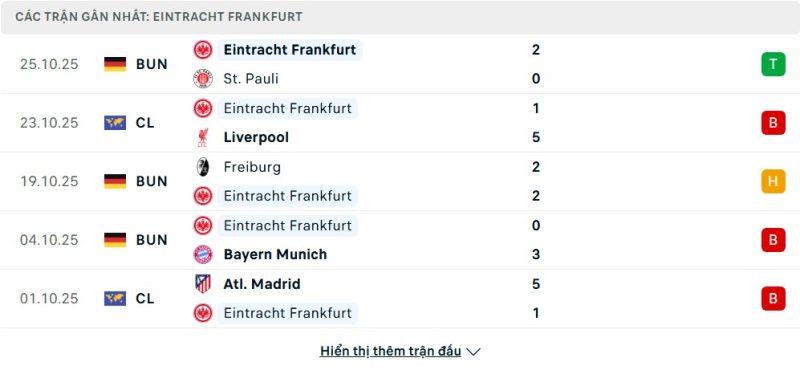 5 trận gần nhất của Eintracht Frankfurt: W-L-D-L-L