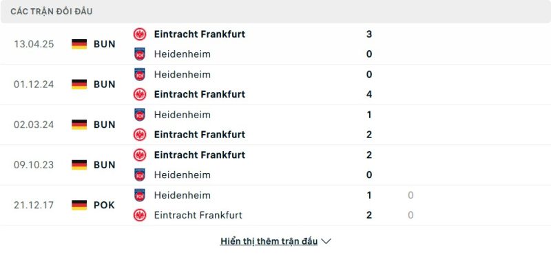 Thành tích đối đầu của 1. FC Heidenheim vs Eintracht Frankfurt