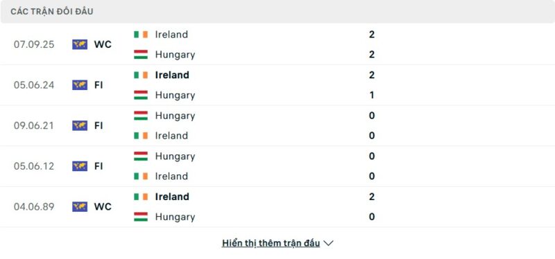 Thành tích đối đầu của Hungary vs Ireland